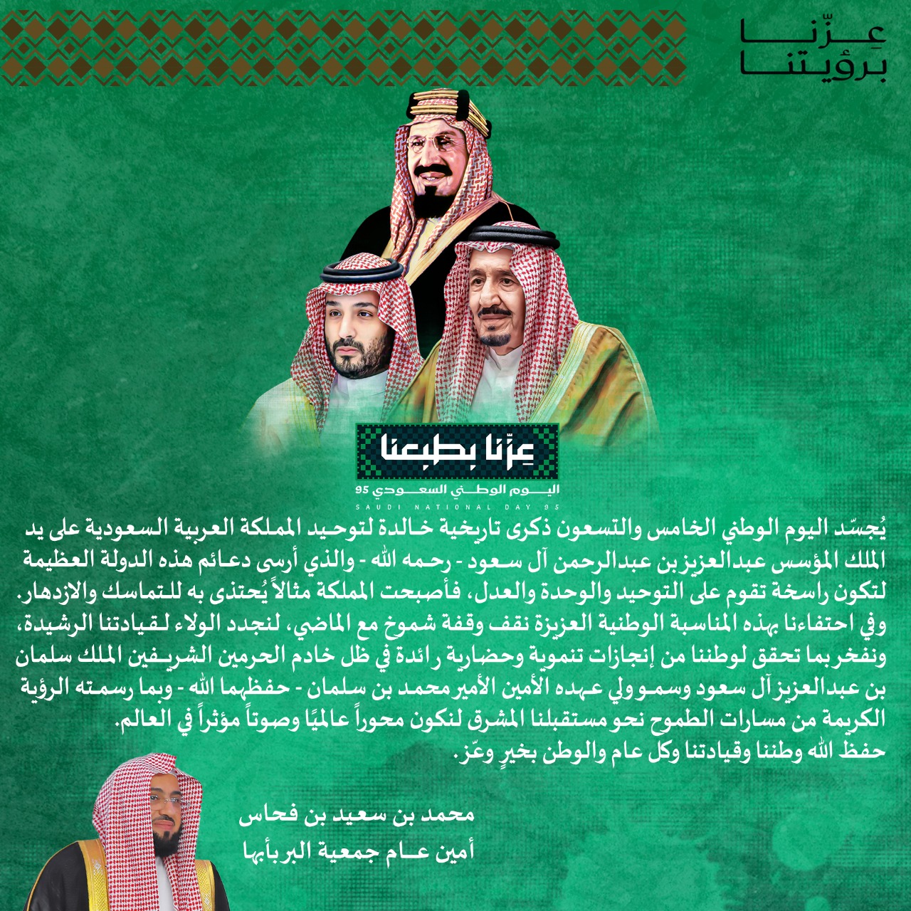 2025-09-22 يُجسّد اليوم الوطني الخامس والتسعون ذكرى تاريخية خــــالدة لتوحــــيد الممـــلكة العـربية الـسعودية على يد الملك المؤسس عبدالعزيز بن عبدالرحمن آل ســــعود - رحــــمه الله - والذي أرسى دعـــائم هذه الدولة العظيمة لتكون راسخة تقوم على التوحيد والوحدة والعدل، فأصبحت المملكة مثالاً يُحتذى به للـــتماسك والازدهار. وفي احتفاءنا بهذه المناسبة الوطنية العزيزة نقف وقفة شموخ مع الماضي، لنجدد الولاء لـــقــيادتنا الرشيدة، ونفخر بما تحقق لوطننا من إنجازات تنموية وحضارية رائدة في ظل خادم الحرمين الشريــــــفين المـــلك سلمان بن عبدالعزيز آل سعود وسمــــو ولي عـــهده الأمين الأمير محمــد بن ســلمان - حفظهما الله - وبما رسمـــته الرؤية الكريمة من مسارات الطموح نحو مستقبلنا المشرق لنكون محوراً عالميًا وصوتاً مؤثراً في العالم. حفظ الله وطننا وقيادتنا وكل عام والوطن بخيرٍ وعّز . محمـد بن سعـيد بن فحاس أمين عام جمعية البر بأبها